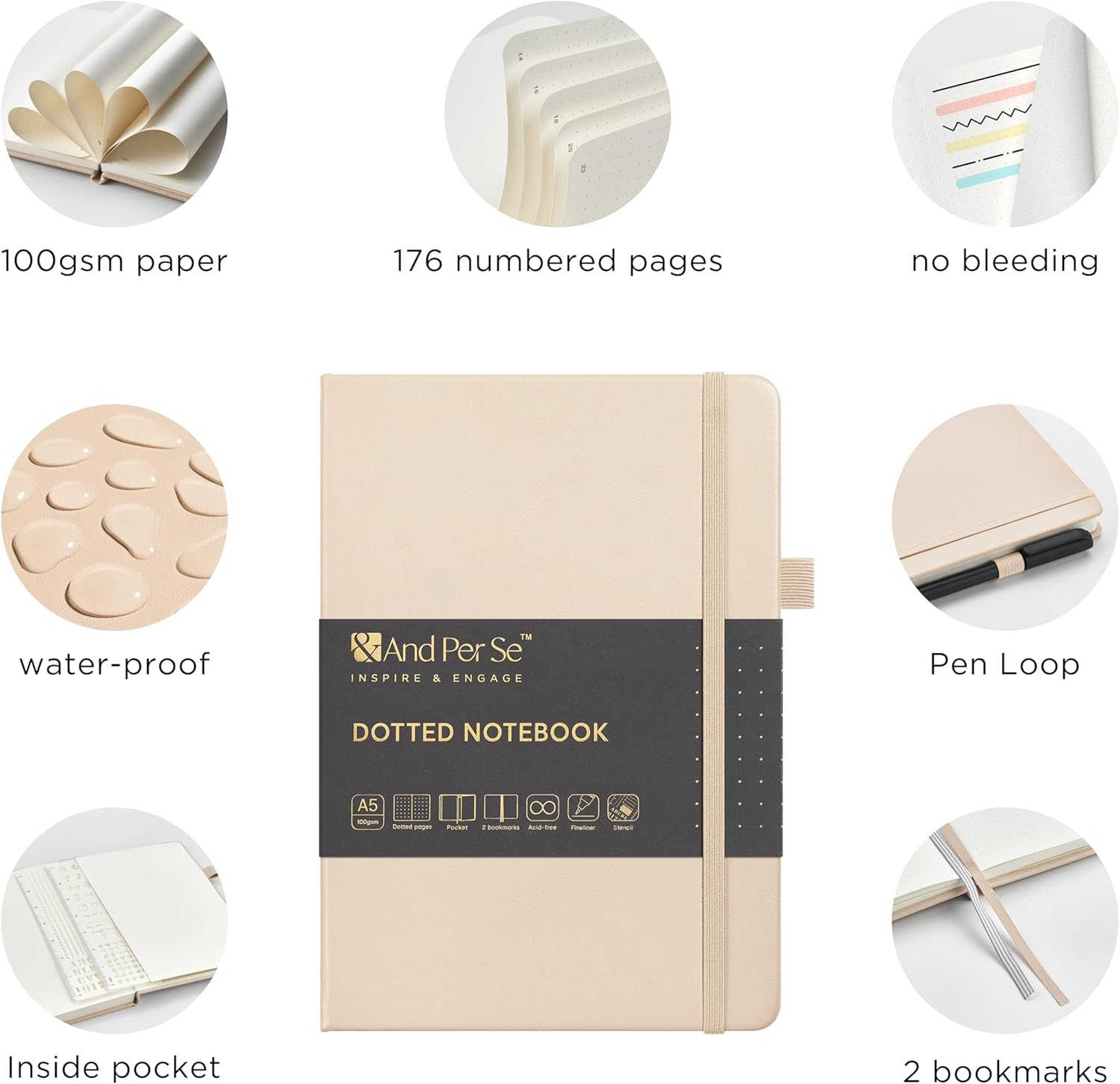 &And Per Se Bullet Dotted Journal Notebook, A5 Leather Hardcover, 176 Numbered Pages 100GSM Thick Dotted Paper, 2 Sheets of Stencils Included - 5.7'' x 8'' (Light Apricot)