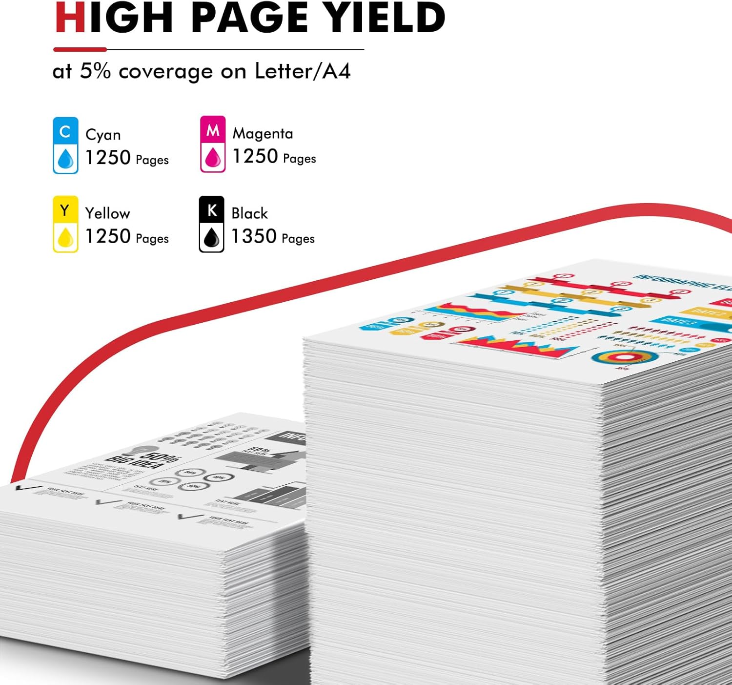 - High page yield: 1,350 (black) and 1,250 (color) based on 5% coverage (letter/a4)