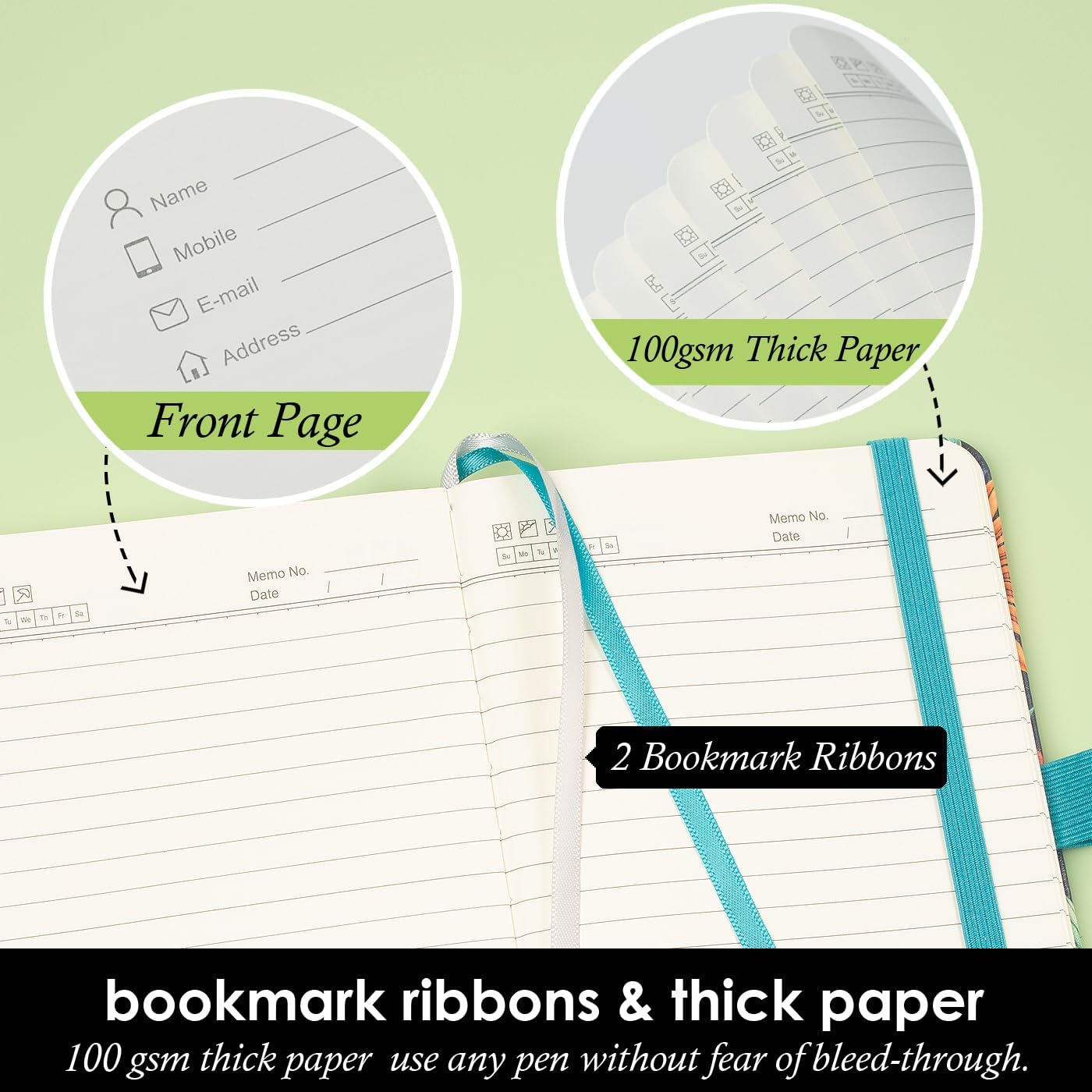 - The small notebook is made of 100gsm ivory thick paper, the paper is smooth, the writing is smooth, and the ink will not bleed. The pocket notebook comes with elastic pen holder loop, elastic closure, and 2 colorful ribbon bookmarks.