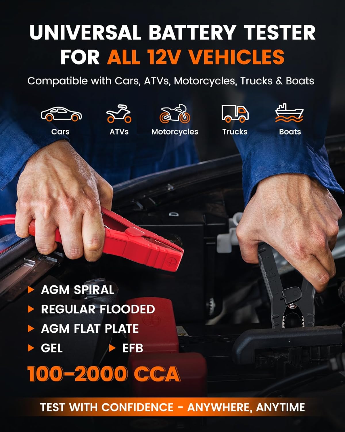 - Works with Most Cars & Batteries - Check Your Vehicle with Confidence : -- Compatible with all OBD2-compliant vehicles manufactured after 1996 (US), 2000 (EU), and 2006 (Asia). This includes cars, SUVs, light trucks, and hybrids. The battery tester accurately analyzes standard 12V lead-acid, AGM, flat plate, and enhanced flooded batteries. Note: Not for 24V systems or Lithium-ion batteries.